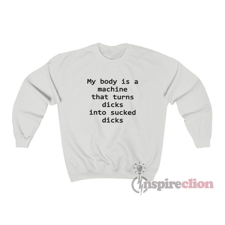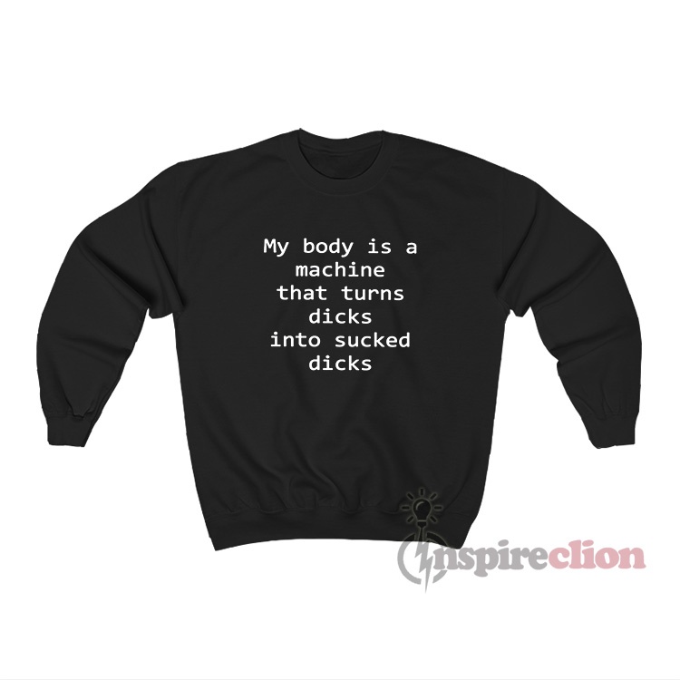 For sale are these My Body Is A Machine That Turns Dicks Into Sucked Dicks Sweatshirt